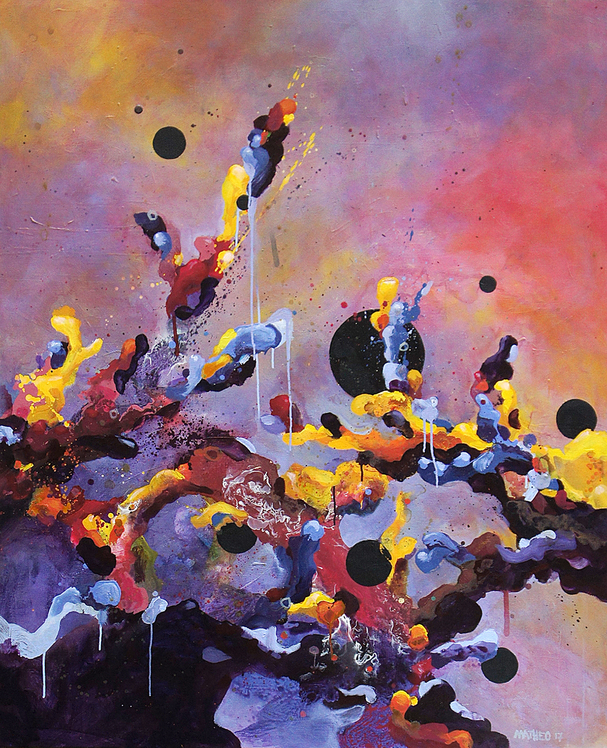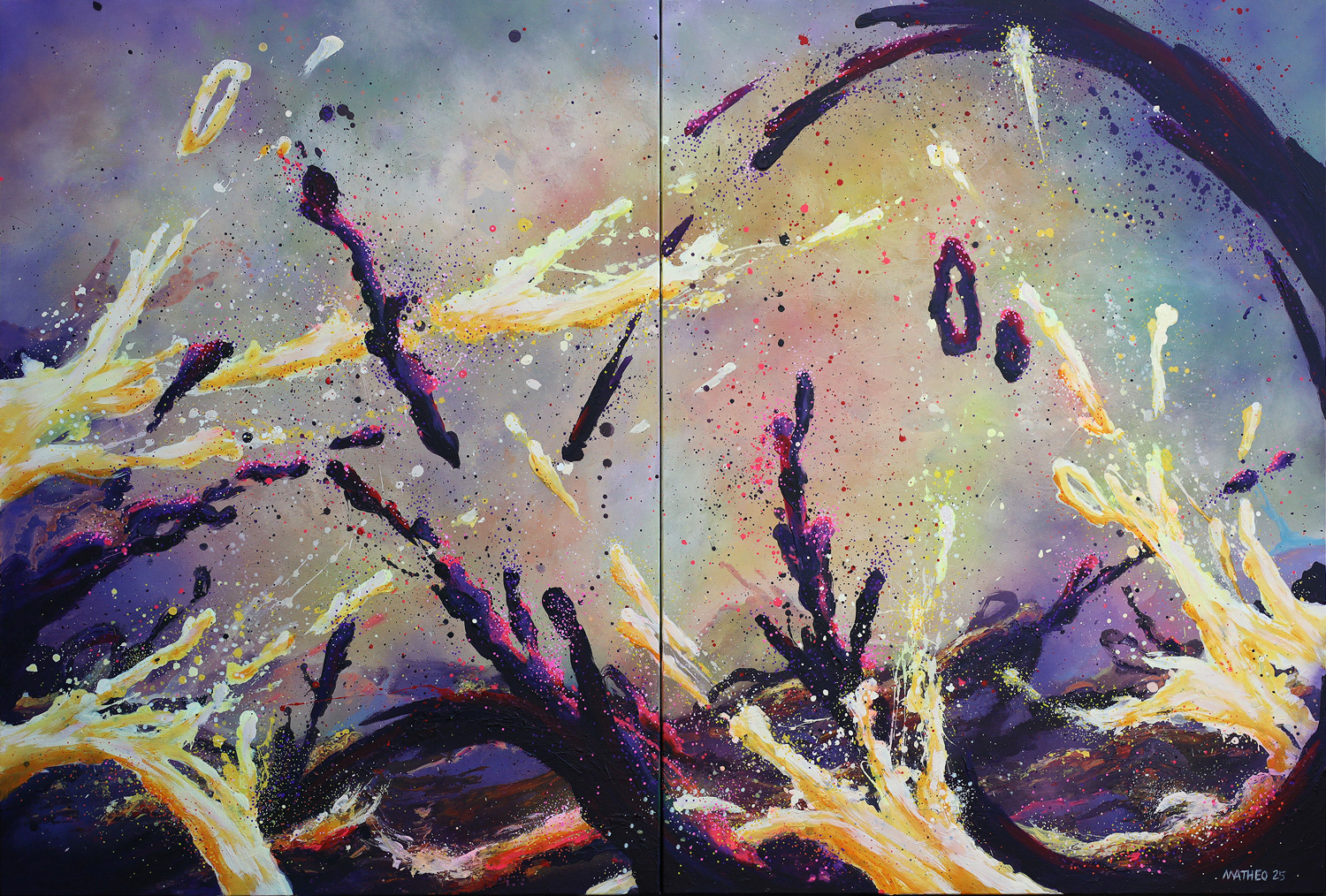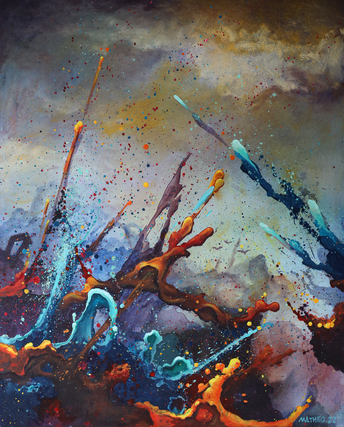 Abstract Landscape est sans doute la série que j'ai le plus poussée à ce jour. Elle tente de "figurer" les forces qui animent l'univers et toute chose (un peu comme le Conatus de Spinoza, la volonté de puissance de Nietzsche ou encore la pulsion en psychologie). Ces peintures sont l'expression de la rencontre éternelle en chaos et cosmos, les toiles se font théâtre où l'invisible essence de la vie prend forme et devient couleur.