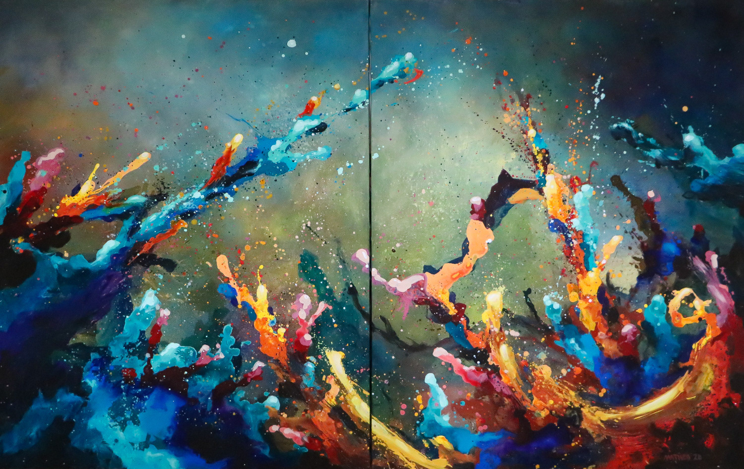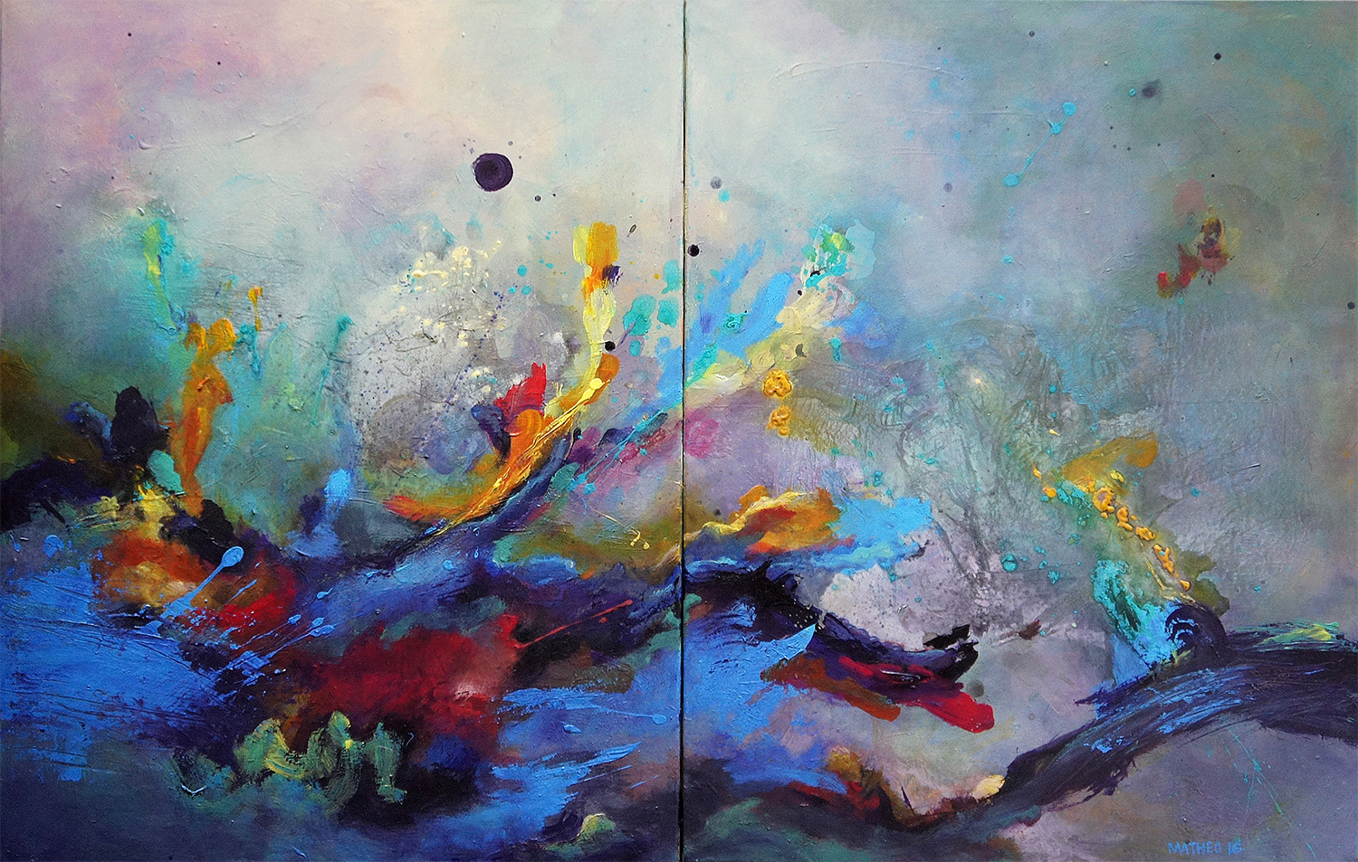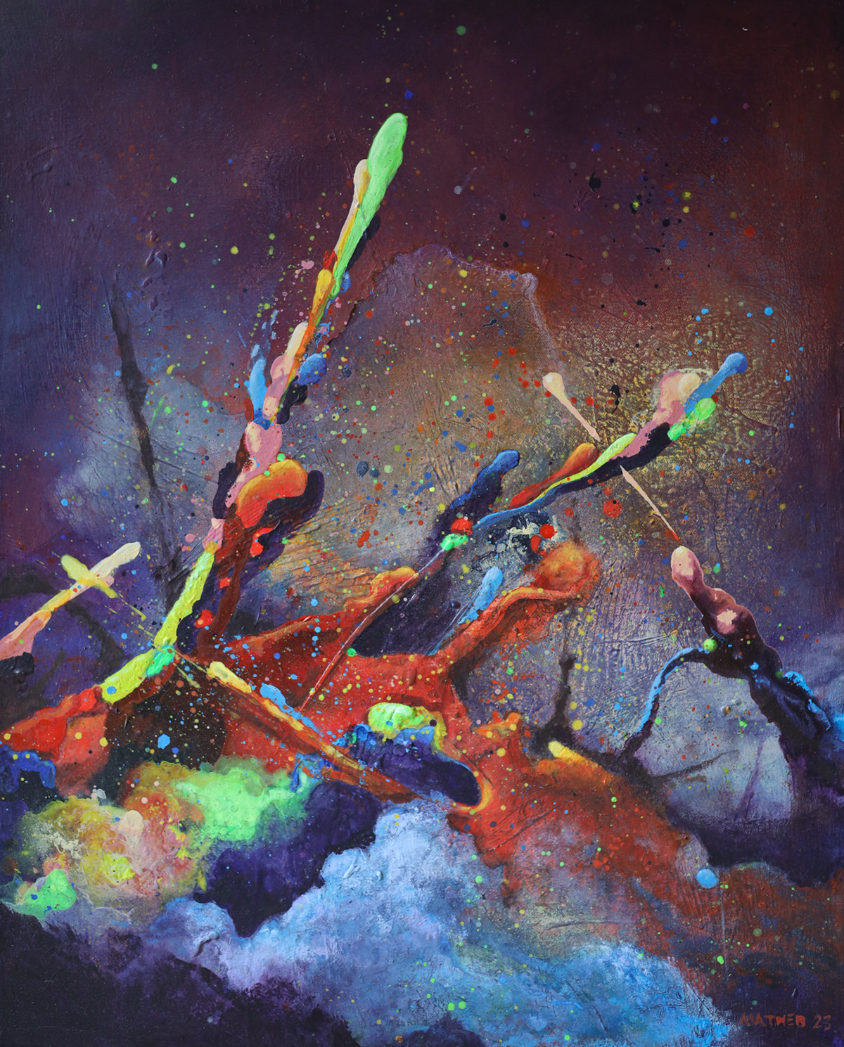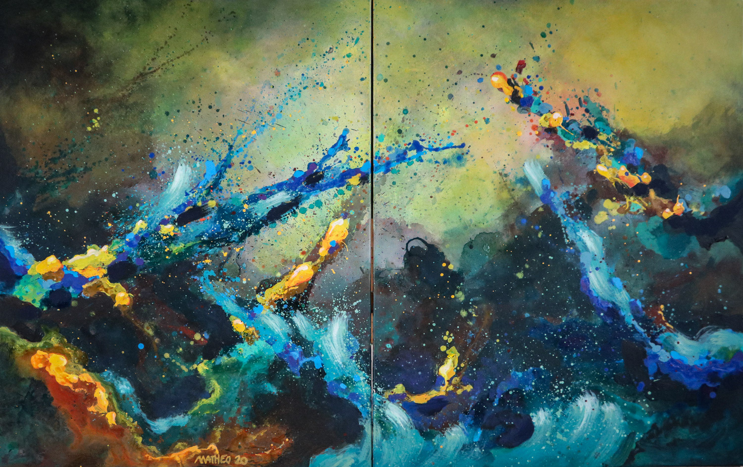Abstract Landscape est sans doute la série que j'ai le plus poussée à ce jour. Elle tente de "figurer" les forces qui animent l'univers et toute chose (un peu comme le Conatus de Spinoza, la volonté de puissance de Nietzsche ou encore la pulsion en psychologie). Ces peintures sont l'expression de la rencontre éternelle en chaos et cosmos, les toiles se font théâtre où l'invisible essence de la vie prend forme et devient couleur.